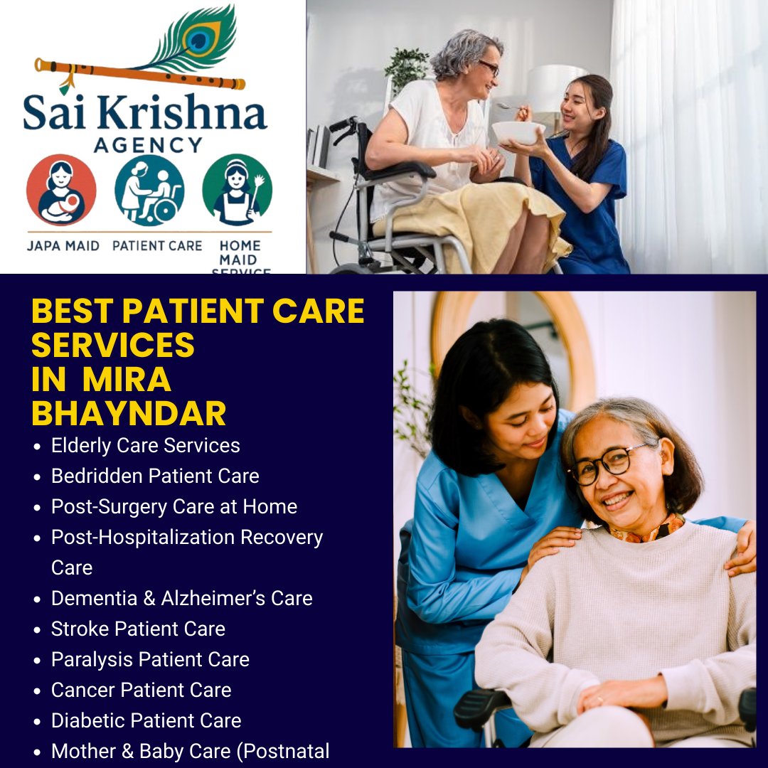 Patient Care Services in Mira Bhayandar – Trusted Home Nursing & Elderly Care At Sai Krishna Maid Services, we provide professional and affordable patient care services in Mira Bhayandar to support patients, elders, and those recovering from illness or surgery. Our trained caregivers and attendants specialize in elderly care, bedridden patient care, post-hospitalization recovery, mother & newborn care, and home nursing services, ensuring complete comfort and dignity at home. We offer full-time, part-time, and live-in patient care services in Mira Bhayandar, with 24/7 availability for families who need reliable support. Every caregiver is verified, skilled, and compassionate, giving you peace of mind that your loved ones are in safe hands. Why choose our Patient Care Services in Mira Bhayandar? Skilled & trained caregivers and attendants Elderly & bedridden patient care at home Post-surgery & recovery care support Safe, hygienic & compassionate service Affordable, customized care packages With Sai Krishna Patient Care Services in Mira Bhayandar, Maharashtra, you can be assured of professional medical support and dedicated care for your loved ones at home. 💙