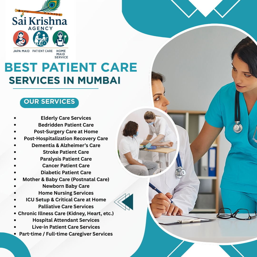 Patient Care Services in Mumbai – Professional Home Nursing & Elderly Support Looking for reliable patient care services in Mumbai? At Sai Krishna Maid Services, we provide trained and compassionate caregivers, attendants, and home nurses to support patients, elders, and those recovering from surgery or illness. Our staff is experienced in elderly care, bedridden patient care, post-hospitalization recovery, mother & baby care, medicine management, and hospital attendant support, ensuring comfort and dignity at home. We offer 24/7 patient care services in Mumbai with flexible options like part-time, full-time, and live-in caregivers. Each member of our team is verified, professional, and caring, giving families peace of mind and trusted healthcare support at home. Why choose our Patient Care Services in Mumbai? Skilled & trained attendants and caregivers Elderly & bedridden patient support Post-surgery & recovery care at home Mother & newborn care services & customized packages Safe, hygienic & compassionate care With Sai Krishna Patient Care Services in Mumbai, Maharashtra, you can be assured of quality healthcare support and professional care for your loved ones right at home.